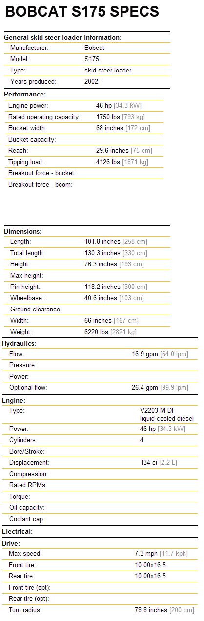 Web Specs For The Bobcat S175.