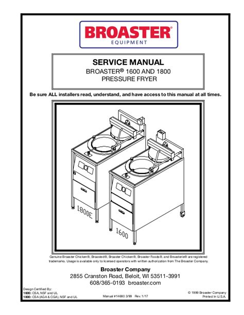 Broaster 1800 Manual. Be sure all installers read, understand, and have access to this manual at all times. Be sure all installers read, understand, and have access to this manual at all times.